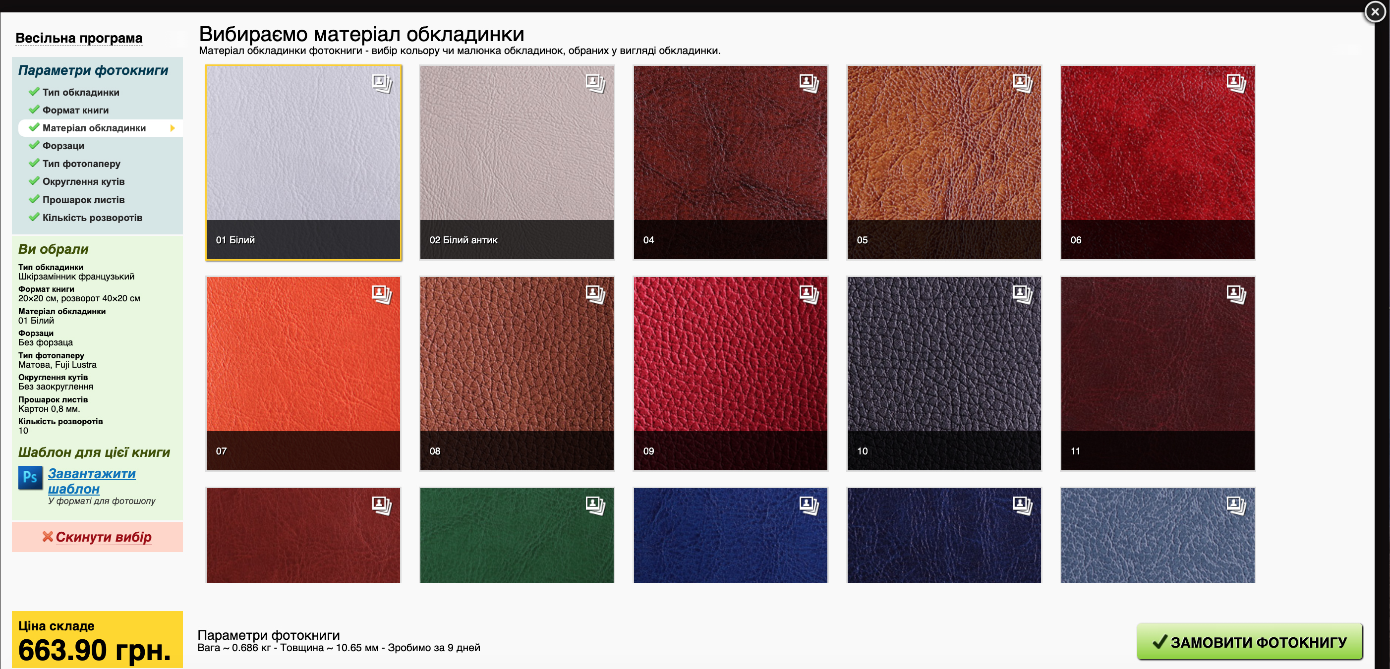 Після того як ми вибрали програму, переходимо до формування параметрів вашої фотокниги, тут вибираємо всі параметри формату, типу обкладинки, паперу і т.д., відразу бачимо ціну, масу та термін виробництва фотокниги, а також можемо завантажити порожні шаблони для фотошопу (у них виставлено точний розмір файлів макетів для вибраної фотокниги, про це в іншій статті нижче).
