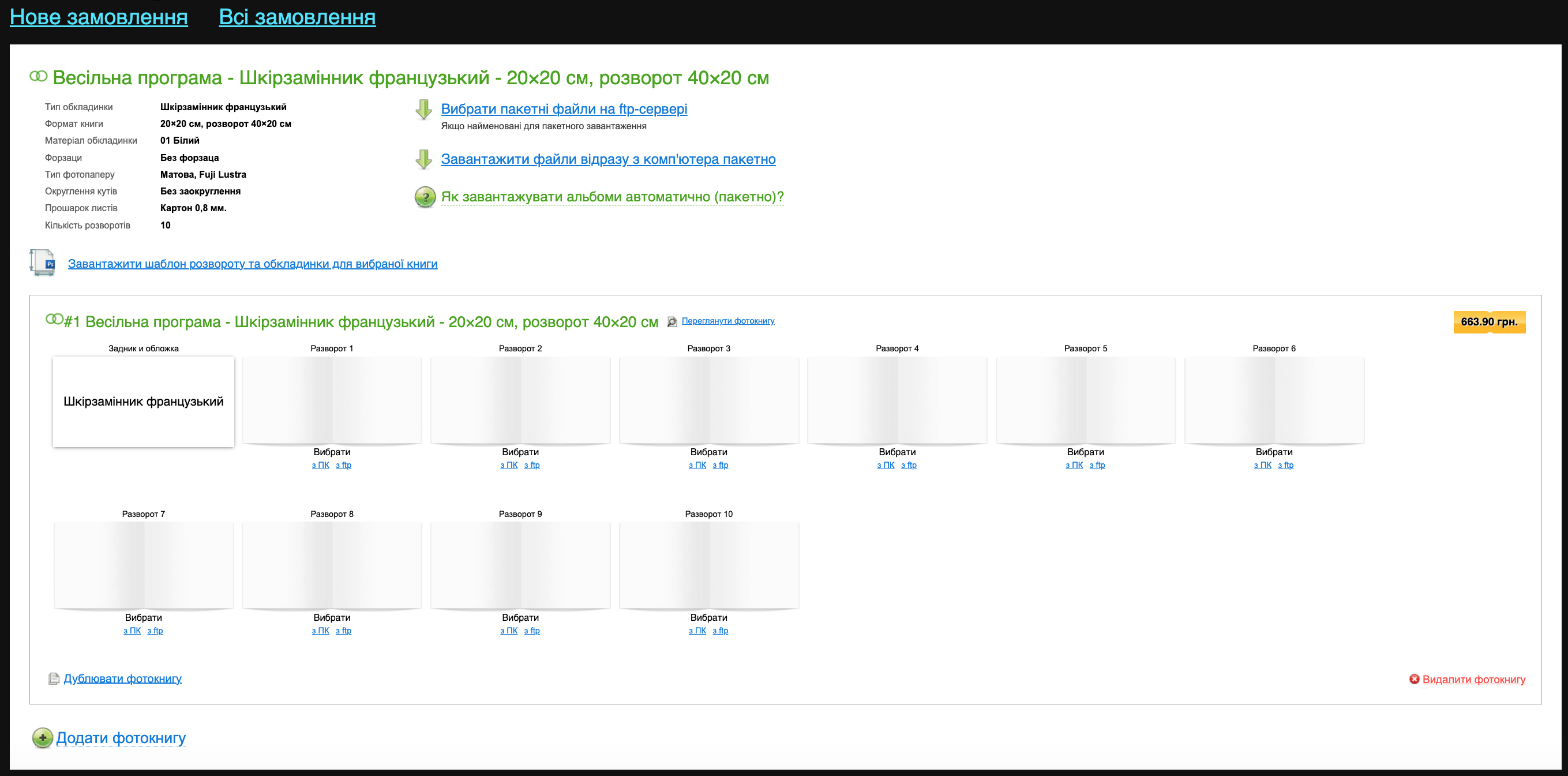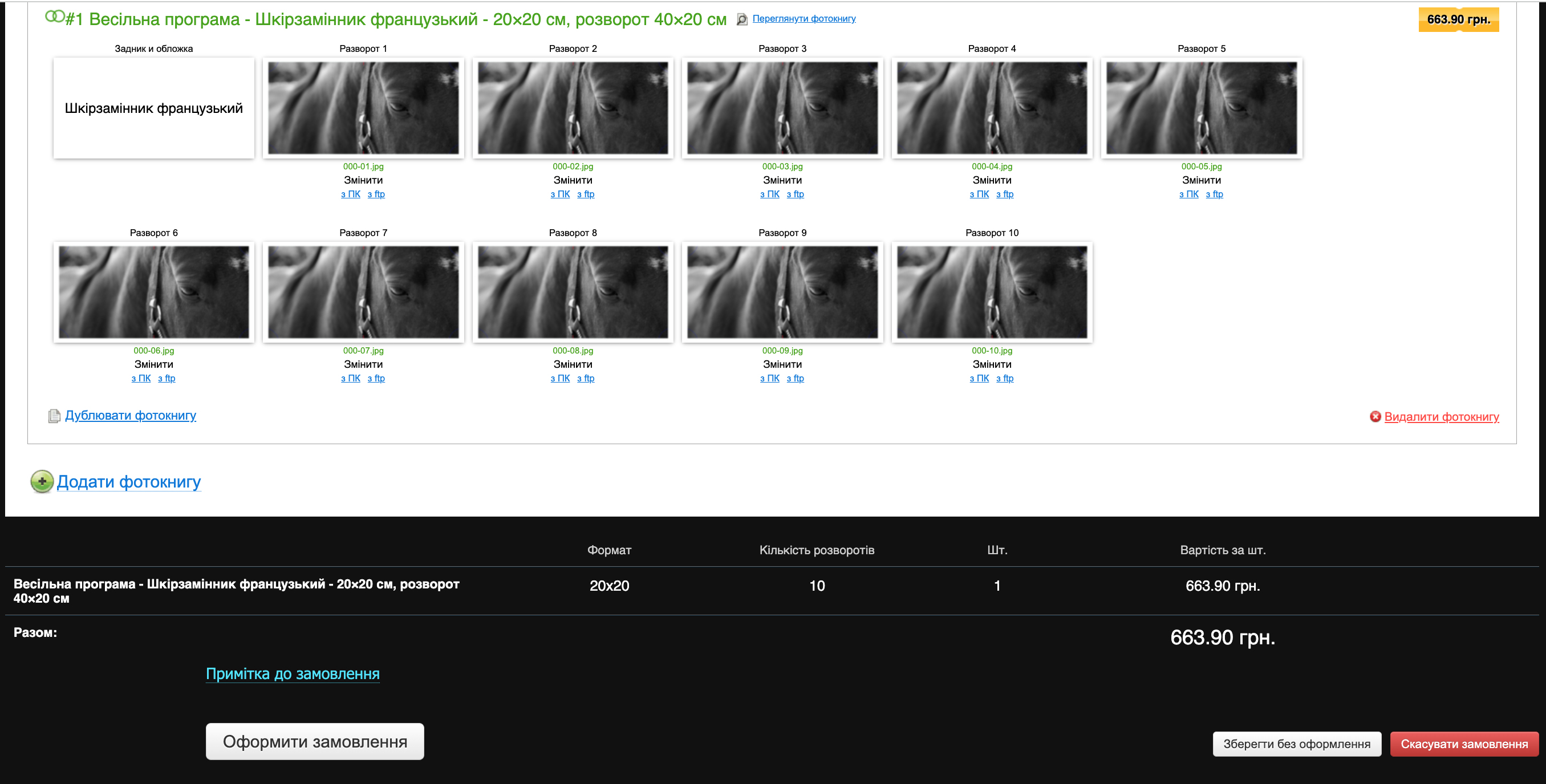 Після того, як книга заповнена, ми візуально бачимо порядок розворотів у книзі і можемо перейти до оформлення замовлення (якщо заповнені не всі розвороти, кнопка оформити буде не активна, то ви не зможете її натиснути).