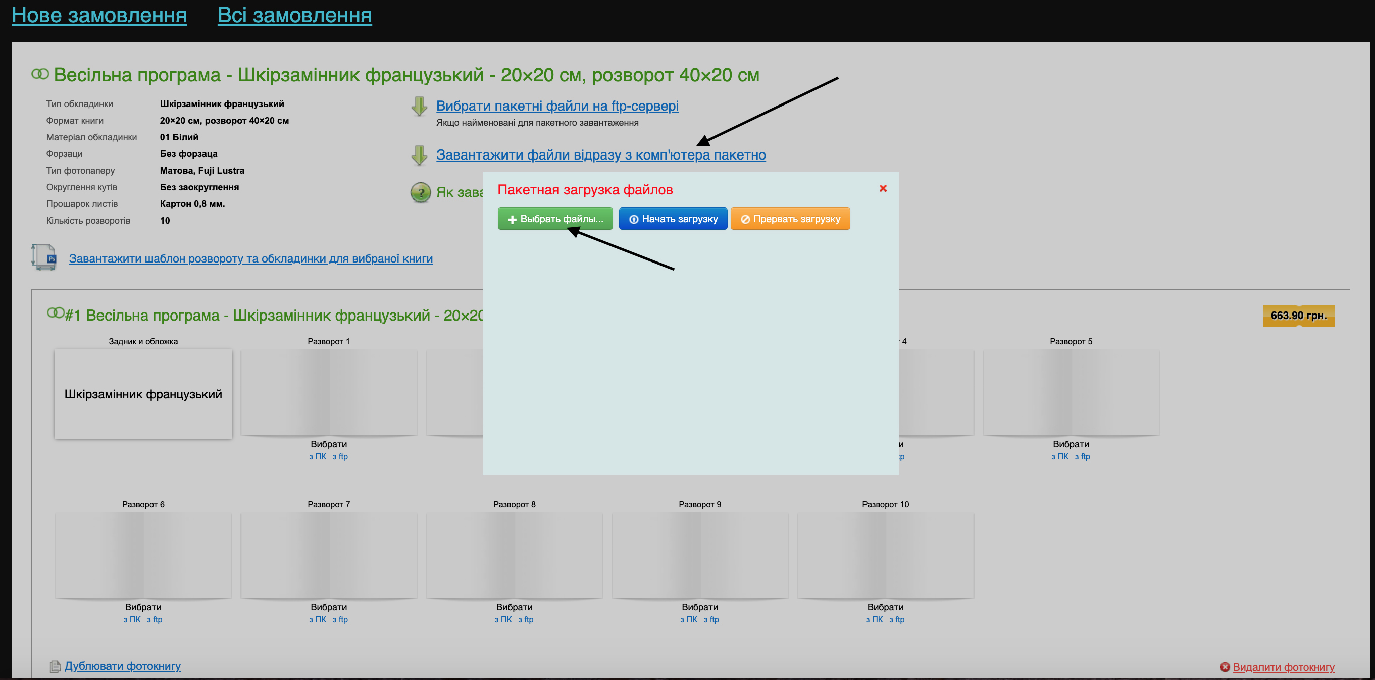 Є кілька способів завантаження та заповнення книги: пофайловий та пакетний. Пофайловий передбачає що ви вручну вибираєте з комп'ютера і завантажуєте макет для кожного розвороту (процес завантаження може бути тривалим). Спростити завдання можна, завантаживши файли пактно.