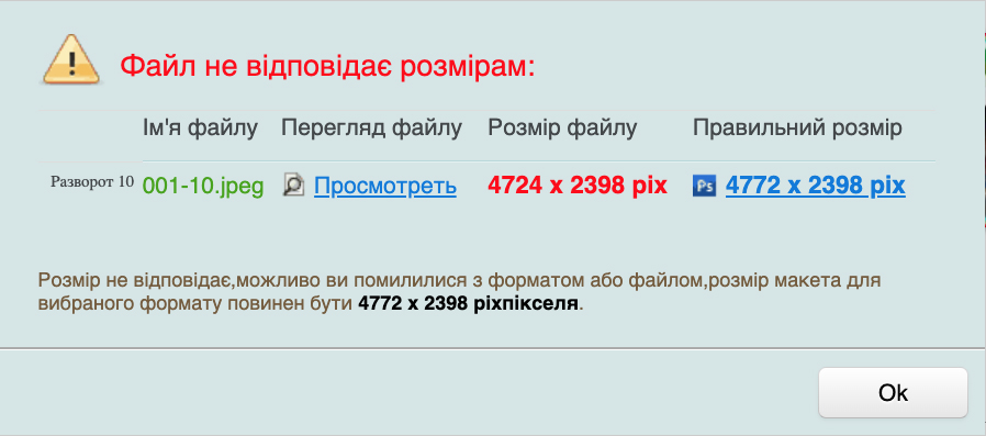 Система перевірить розміри файлів макетів на відповідність необхідним розмірам, і у разі невідповідності більше 12 пікселів видасть попередження, ви можете проігнорувати його, якщо впевнені, що файл коректно надрукується, або повернутися до формування замовлення та виправити зазначений макет.