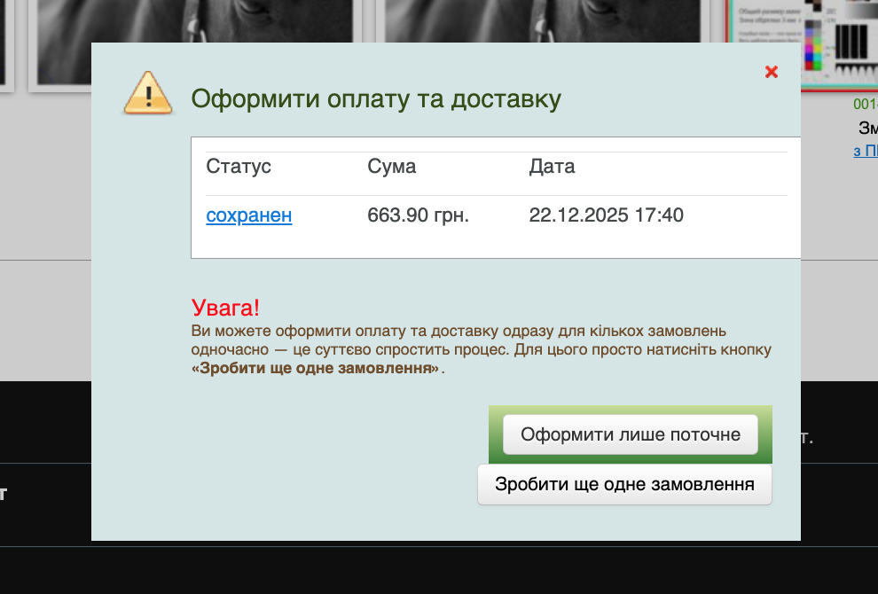 Після того як ви підтвердили завершення цього замовлення, вам запропонують створити ще одне замовлення (формувати групу) для єдиного оформлення, оплати та доставки.